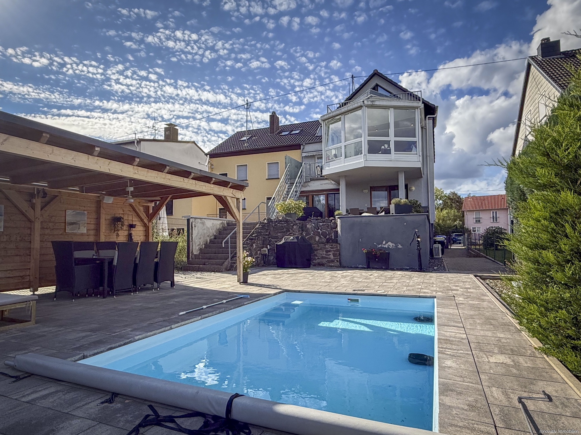 Der Gartenbereich des Hauses bietet mit seiner einladenden Poollandschaft, die optimal für Pool- und Grillpartys mit Freunden geeignet ist, ein weiteres Highlight und der große Gartenbereich bietet ausreichend Platz für spielende Kinder.