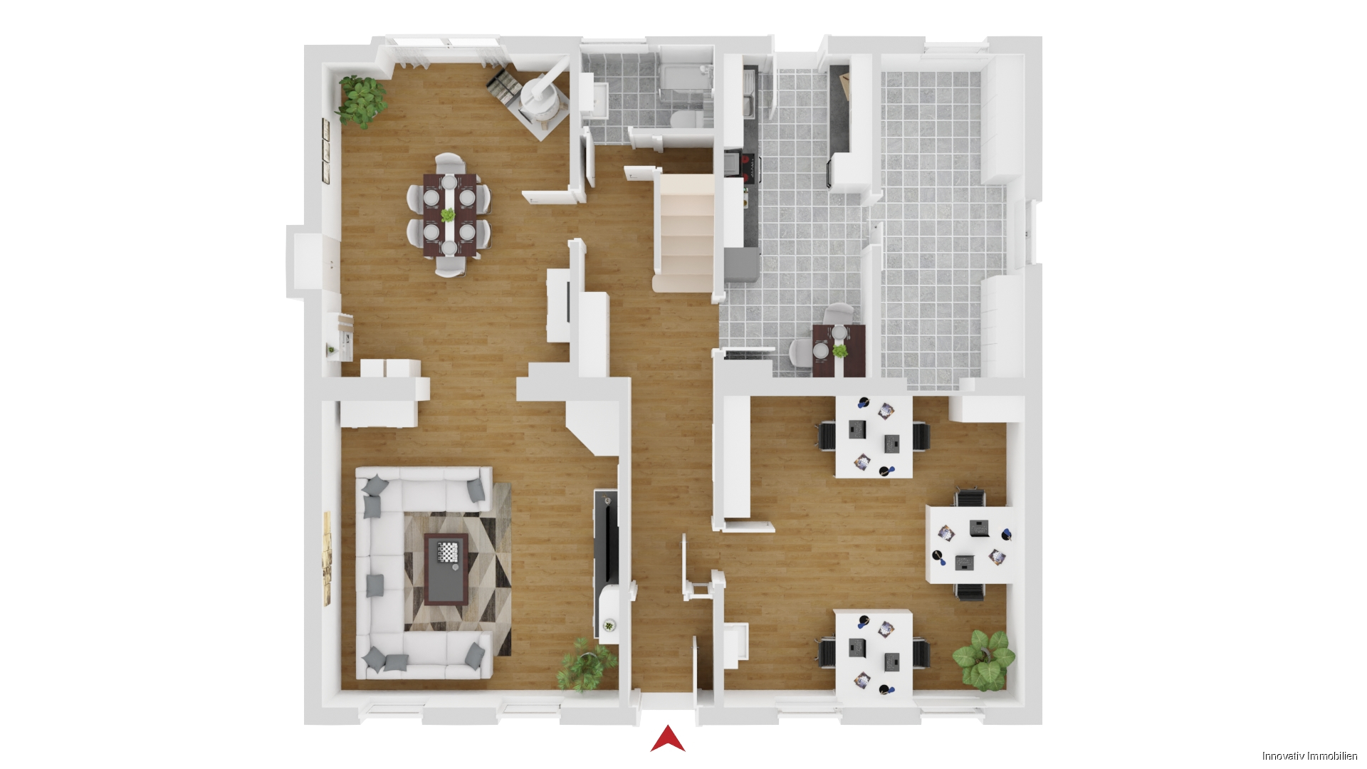 Das Haus empfängt Sie zunächst im Erdgeschoss mit einem einladenden Eingangsbereich sowie dem Hausflur. Über diesen erreicht man den gepflegten und großzügig gehaltenen Wohn- / Essbereich. Ein Pelletofen sorgt hier in kalten Jahreszeiten für wohlige Wärme. Im weiteren Verlauf des Erdgeschosses finden Sie ein abgeschlossenes Zimmer, welches aktuell als Büro dient, ein Badezimmer mit Dusche und Toilette sowie die Küche, an welche sich praktischerweise ein Vorratsraum anschließt.