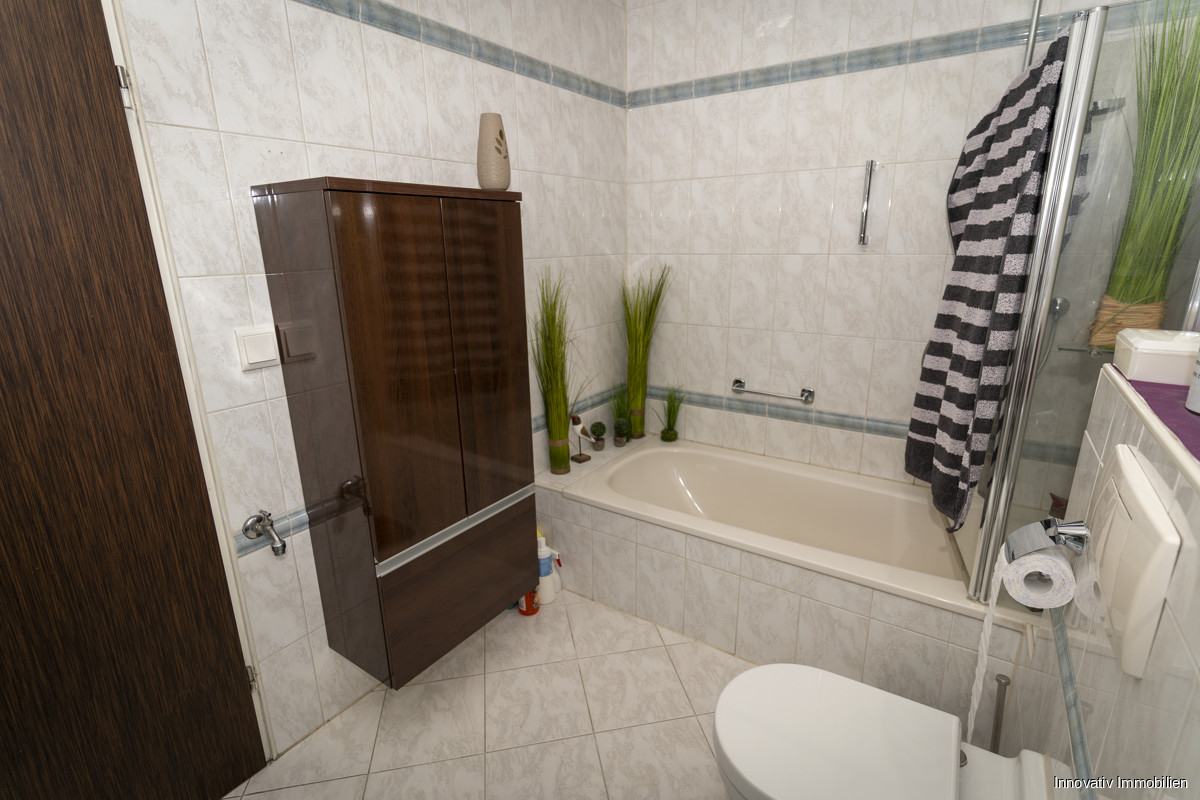 Weiterhin befindet sich ein Bad mit Dusche und Wanne im Wohnflur, der auch weiteren Zugang zum Schlafzimmer und dem Wohnbereich bietet. Das Gesamtbild rundet der überdachte Balkon, geeignet für ein Glas Wein am Abend, ab.
