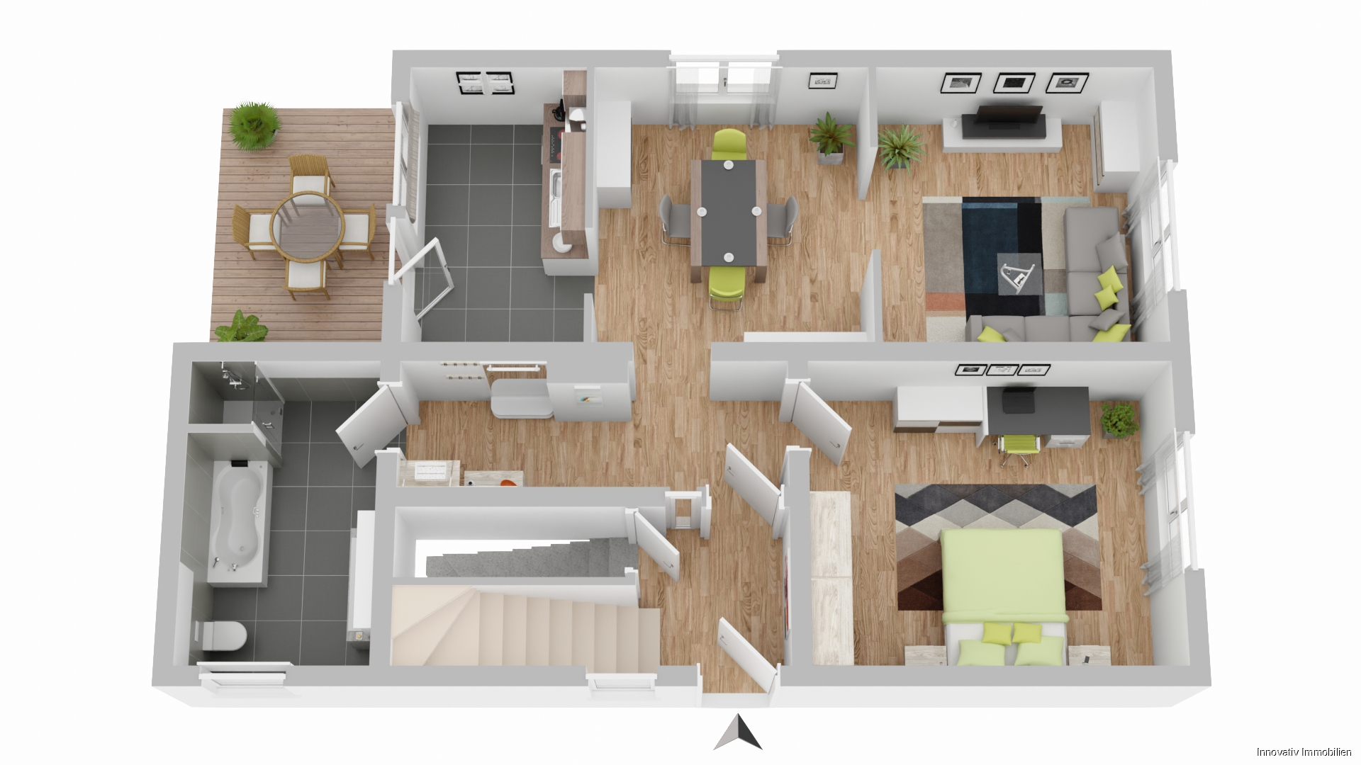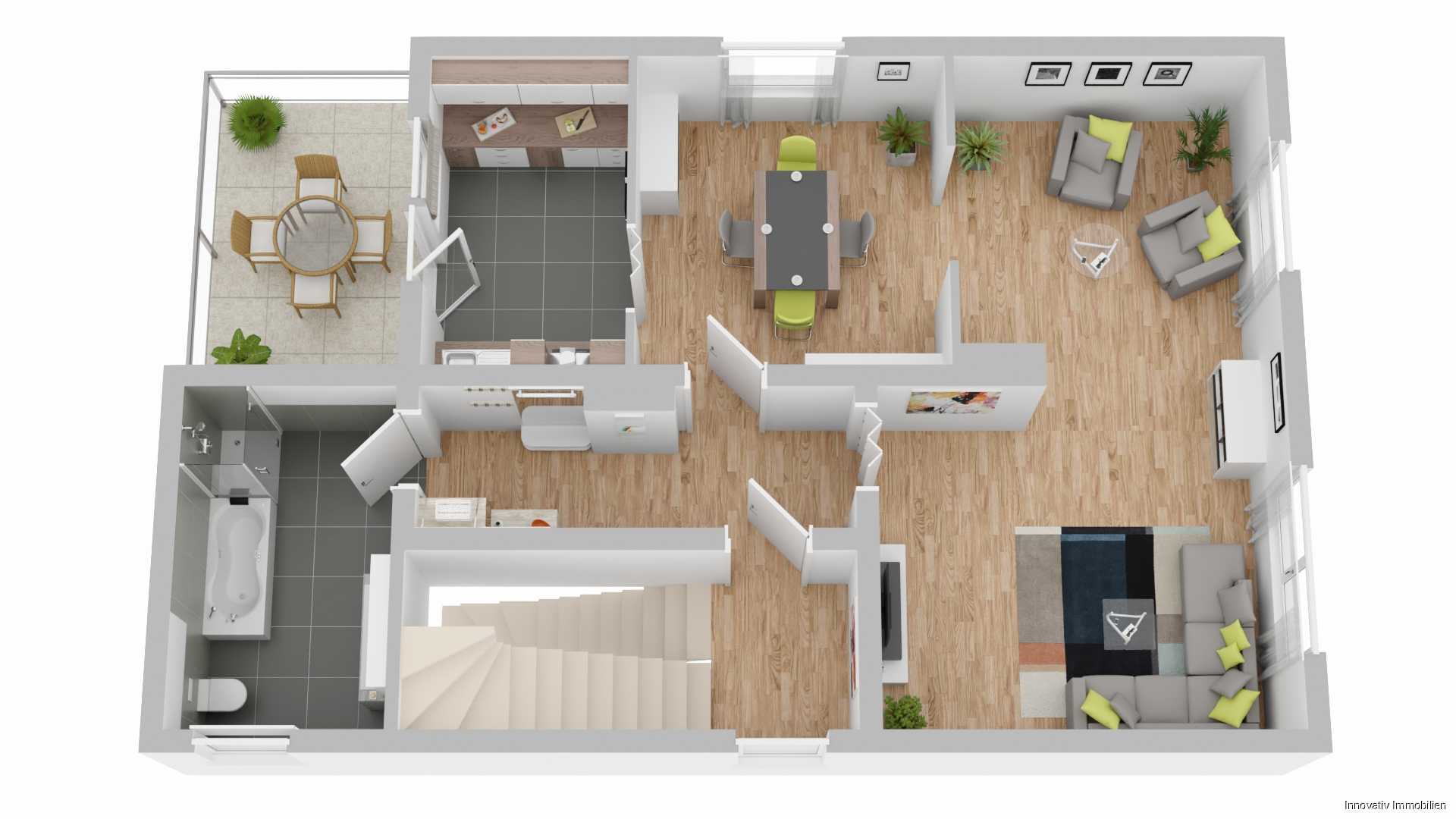 Zurück im Treppenhaus gelangen Sie in das 1. Ober- und auch das Dachgeschoss des Hauses, welche zusammen die 2. Wohneinheit bilden. Zunächst befindet sich im 2. Obergeschoss der Wohnbereich dieser Einheit mit einem Badezimmer mit Wanne und Dusche, dem großzügigen Wohn- Essbereich sowie dem Küchenbereich, an welchen ein gemütlicher Balkon angrenzt.