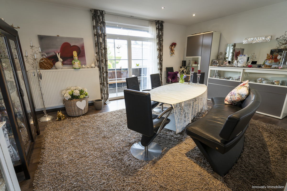 Das Obergeschoss entführt Sie in ein modernes Wohnambiente mit offener Küche, Kamin und angrenzendem Esszimmer für gemütliche Abendstunden mit Freunden.