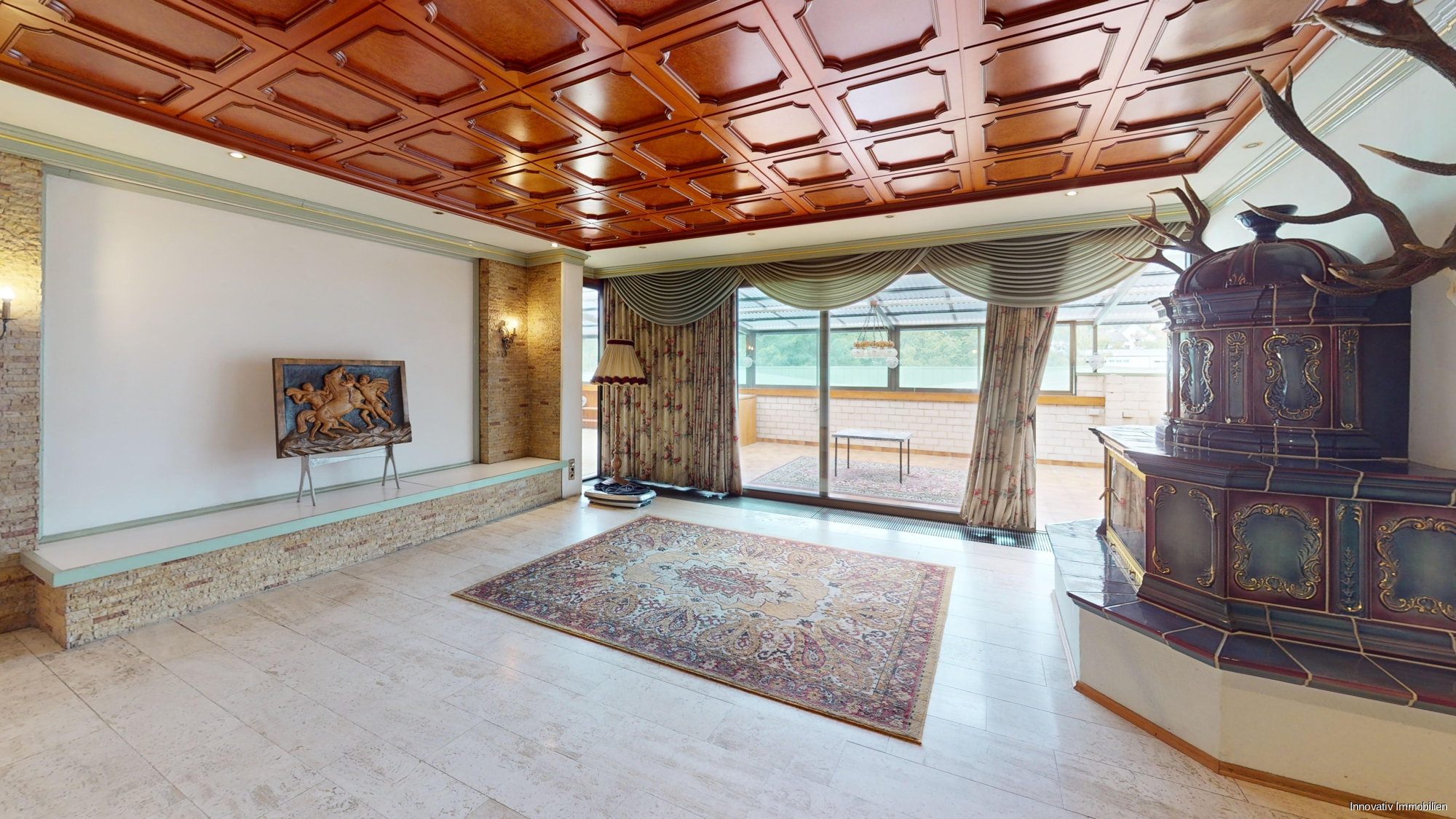 Im Erdgeschoss befindet sich ein modern gestaltetes Schlafzimmer, das neuwertige Bad mit Dusche und die noch unbenutzte Küchenzeile. Über den Küchenbereich machen Sie eine Zeitreise zurück in die 70er und 80er Jahre und gelangen in das traditionell gehalten Esszimmer mit dem großzügig angrenzenden Wohn- und Jagdzimmer. Optisches Highlight ist hier das Wohnzimmer mit Kamin. Zugang erlangen Sie hier rüber auch zum über 40 qm großen Wintergarten, der mit Ideen für eine Bar mit Lounge und Grillecke keine Wünsche zur freien Gestaltung offen läßt. Direkt angrenzend befinden sich zusätzlich, mit separatem Zugang, die 3 Gästezimmer mit integrierten Bädern, die sich auch zu einem großen Raum umgestalten lassen.